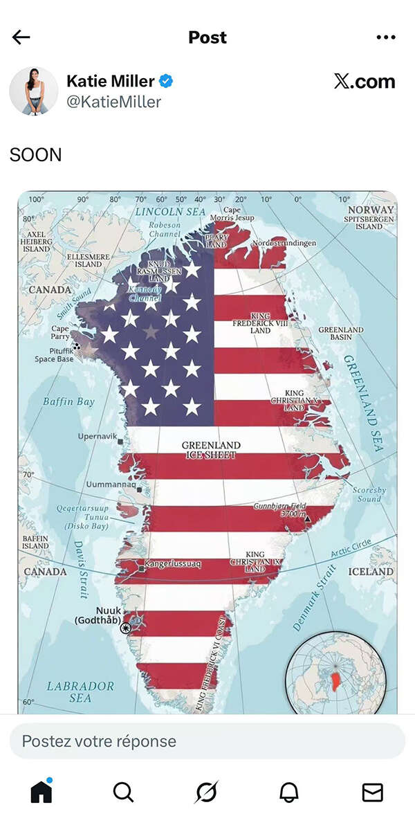 美国国土安全顾问史蒂芬·米勒的妻子在X上发布了一篇推文,展示美国国旗覆盖下的格陵兰岛,并配文全大写的“快了”(SOON)。