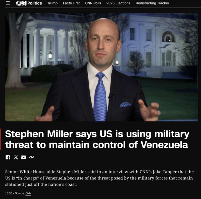 《纽约时报》称,米勒还卖力地为美国入侵委内瑞拉辩护。他对美国有线电视新闻网称,“美利坚合众国在掌控委内瑞拉”,将国际条约中有关国家独立和主权的规定斥为“国际繁文缛节”。