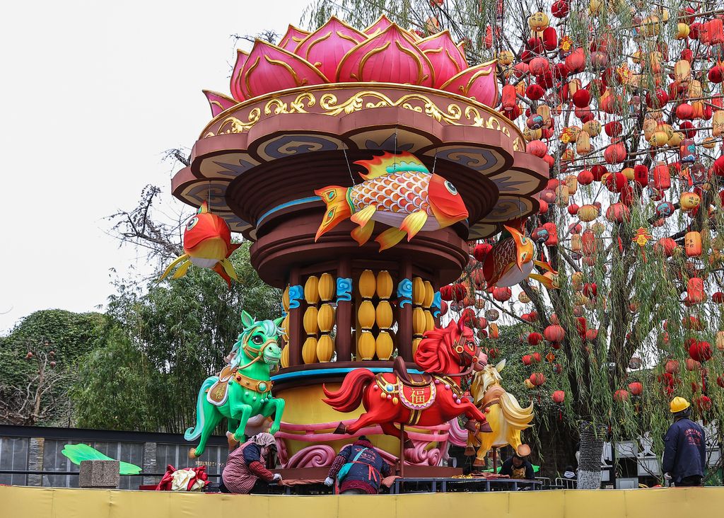 2026年1月6日,江苏南京,工作人员在文化街区内安装大型灯彩,迎接农历马年。