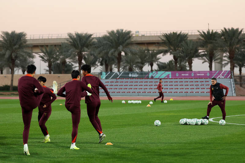 当地时间2026年1月7日,沙特阿拉伯,U23国足主教练安东尼奥(右)带领队员训练。视觉中国供图