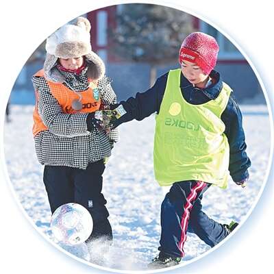 “雪假”期间,内蒙古呼伦贝尔额尔古纳市学生参加雪地足球活动。