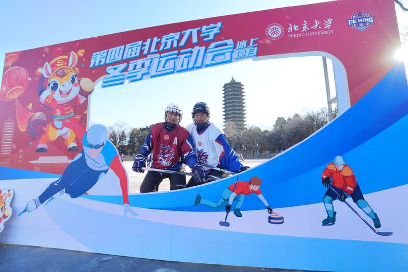 8时30分,北大以一场热闹的校园冬季冰上运动会给未名湖冰场重启“剪彩”。冰球射门、冰壶掷准、冰车漂移、雪圈竞速等冰上竞赛项目在冰面展开,吸引众多师生体验。校冰球队还表演了一场精彩的冰球赛。