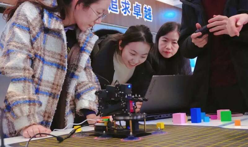 比赛过程中,不同的意外问题挑战着学生的应变能力。视觉组遇到了意想不到的“对手”——活动室的灯光。光线变化导致颜色识别出现偏差,他们不得不现场调整算法参数。“如何在短时间内化险为夷?这比在实验室里难多了!”陈怡瑾同学说起比赛现场还意犹未尽。抓取力度的控制、程序的突然卡顿……平时课堂上提到的理论难题,在实战中变得无比真实。还有一组同学的机械臂电机突然过热导致程序卡顿,全组在10分钟内迅速分工:有人“寻虫”排查代码,有人测试硬件连接,有人想办法降温……这种在真实项目中锤炼出的抗压能力和协作精神,正是学院倡导的核心素养之一。同学们的精彩表现赢得了现场师生的阵阵掌声。