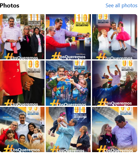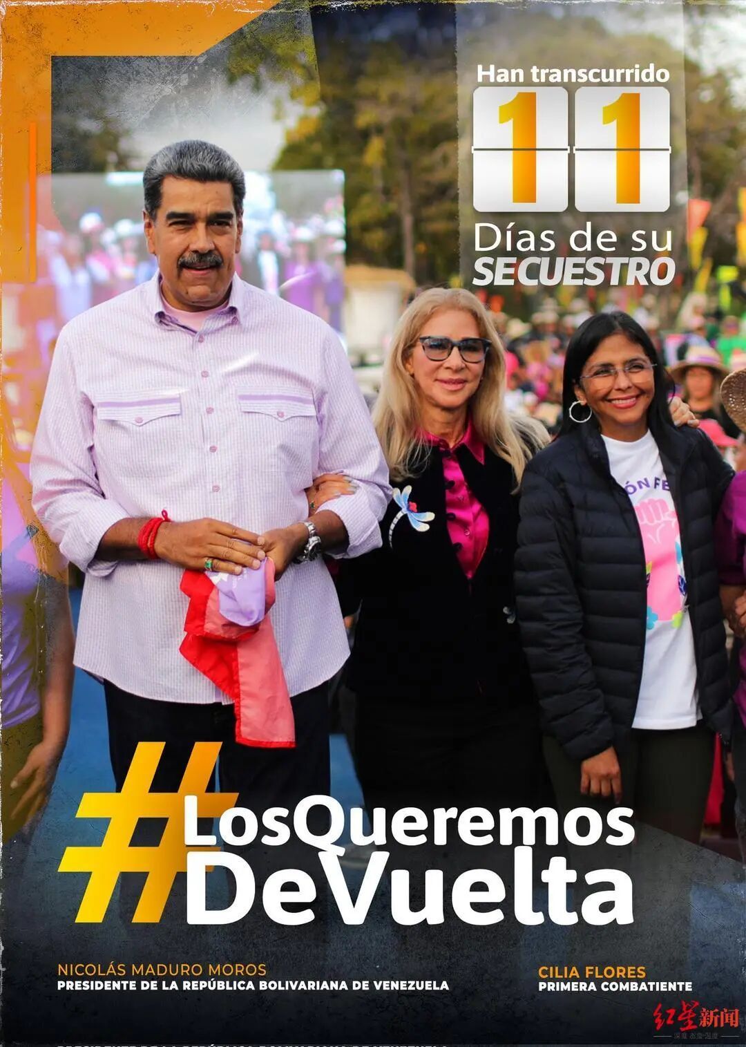 图片右上角写有“被绑架已过去11天”的字样,下方以醒目字体标注“#我们要他们回来”的话题标签。图片底部注明了人物身份,其中马杜罗被标注为“委内瑞拉玻利瓦尔共和国总统”,其妻子西莉亚·弗洛雷斯被标注为“第一斗士(第一夫人)”。