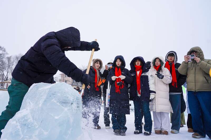 在“冰雪文旅实践”环节,学员走进“中国冰村”主题体验区,观赏唯美冰景,体验冰壶、冰爬犁等10余项冰雪项目。在“民俗文化体验”环节,学员参与铁锅炖大鱼、冰糖葫芦等传统美食制作,体验冬捕等冬季特色民俗活动。