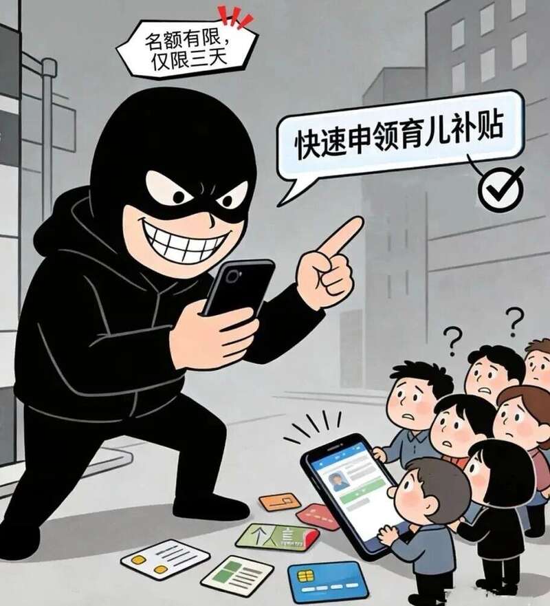 不法分子在互联网群组发布“育儿补贴快速申领”“过期视为放弃”等类型信息,通过“名额有限”“最后三天”等话术制造紧张氛围,声称可“快速申领育儿补贴”,诱导受害人在紧张状态下点击陌生链接。