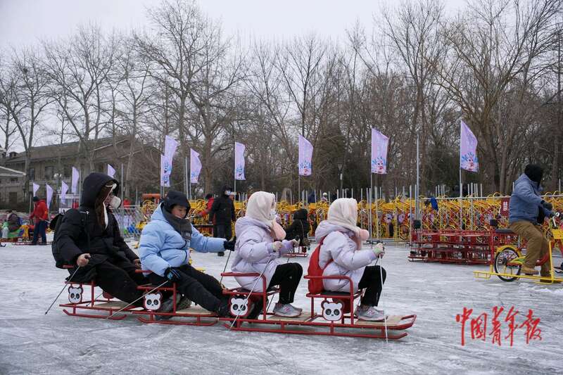 1月17日,北京玉渊潭公园,游客们在冰场上乘坐不同款式的冰车。中青报·中青网记者 田嘉硕/摄