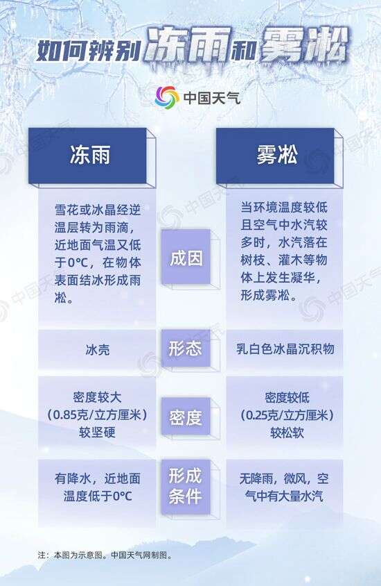 人们常常会把雨凇和雾凇搞混,其实二者的差别还是很大的。雨凇和雾凇都是树挂,但“材质”却不同。雨凇是过冷水滴附着在物体表面结成的冰壳,表面坚硬,且有一定重量,密度较大;雾凇则是乳白色冰晶沉积物,更类似于霜,密度小、重量轻。除了形态之外,雨凇和雾凇形成的条件也不相同,雨凇的诞生离不开天气过程,需要冷暖空气的参与,但雾凇则是由于周围环境长时间气温较低,大量水汽凝华而形成的。