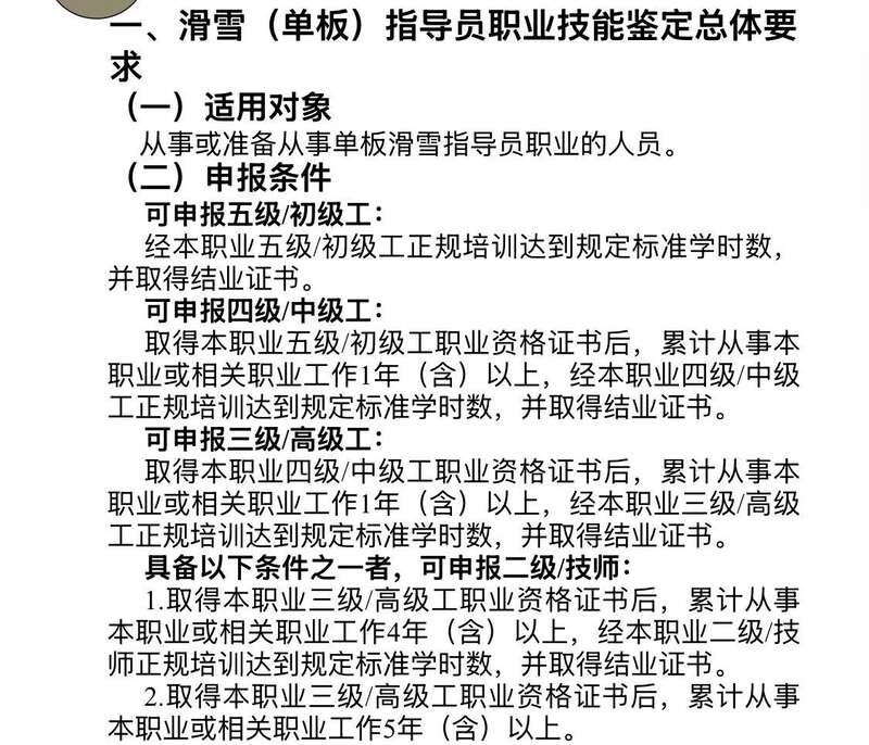 《滑雪(单板)指导员国家职业技能鉴定考核实施细则(2023版)》(简称《细则》)中提到,申报相应级别考试需要正规培训达到规定标准学时数,并取得结业证书。
