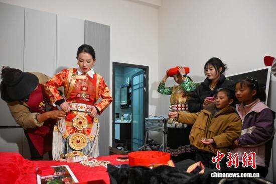 1月24日,在雪域高原云南省迪庆藏族自治州香格里拉市仓觉村,全网粉丝量超30万的藏族姑娘扎史永宗和丈夫扎史培楚举行了一场打破线上与线下、地域与时空、传统与现代多重“次元壁”的婚礼。婚礼上,新人穿着传统藏式婚服,按习俗完成接亲、祈福等仪式,亲朋好友围在一起跳锅庄舞。同时,现场摆放着现代风格的婚纱照,用花艺等做装饰,还通过5G网络直播,让没能到场的网友也能身临其境,传统婚俗在现代表达中焕发新生。图为亲友团姑娘为扎史永宗(左)整理发饰。