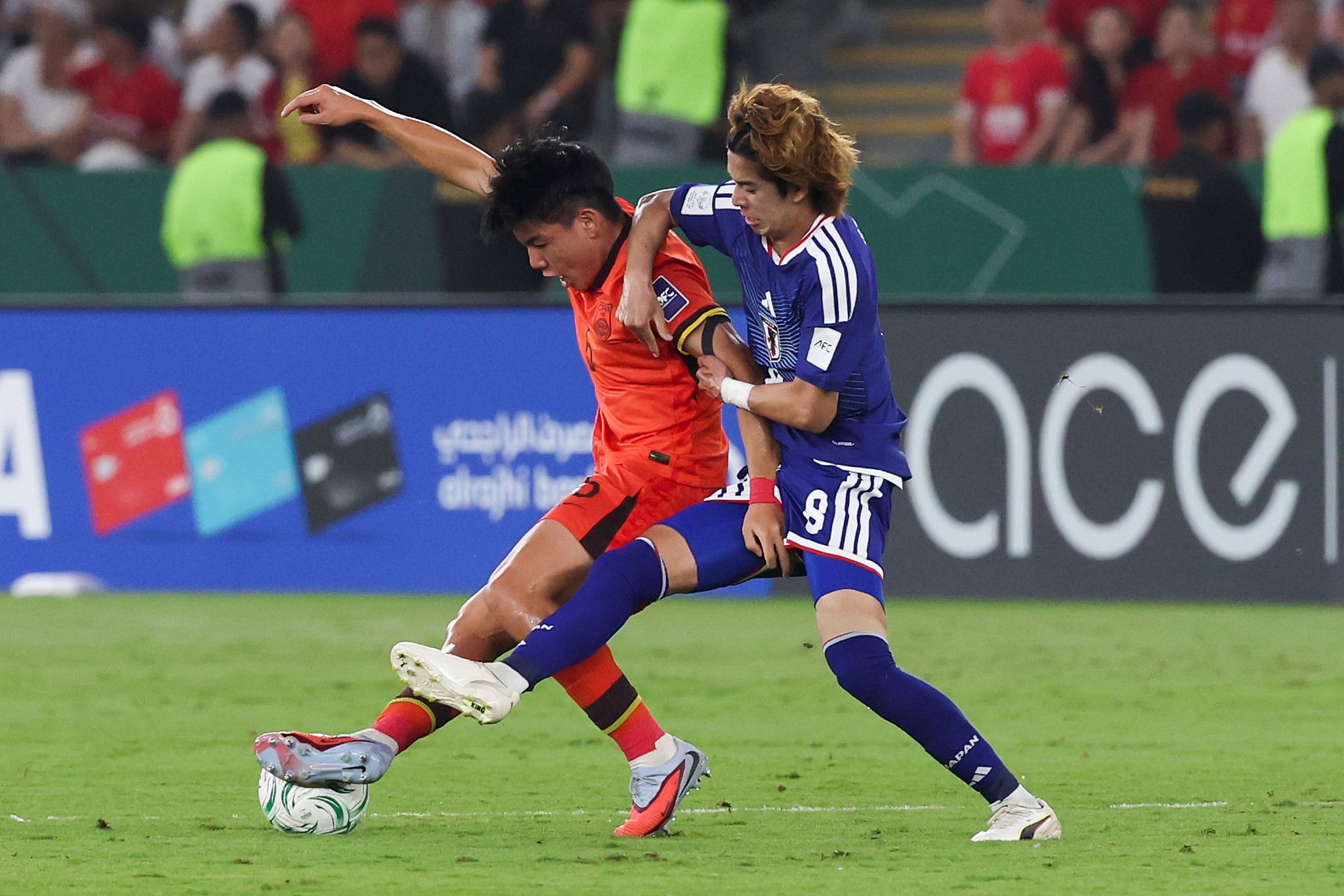 当地时间1月24日,2026年U23亚洲杯决赛中,徐彬与日本队队员拼抢。视觉中国供图