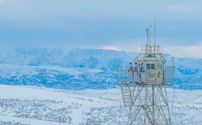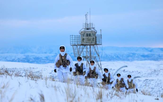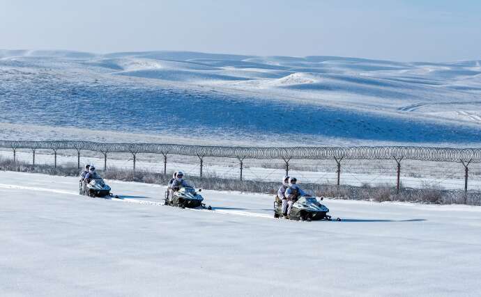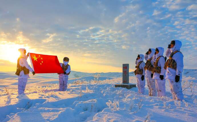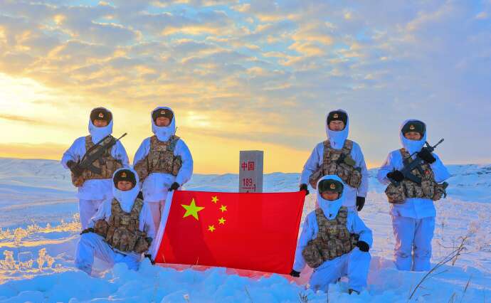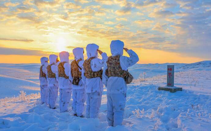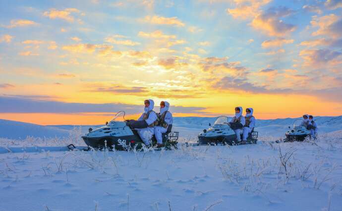 近日,新疆军区某边防连官兵冒严寒、踏深雪,采取乘摩托雪橇和徒步相结合的方式执行巡逻任务,确保边境地区安全稳定。