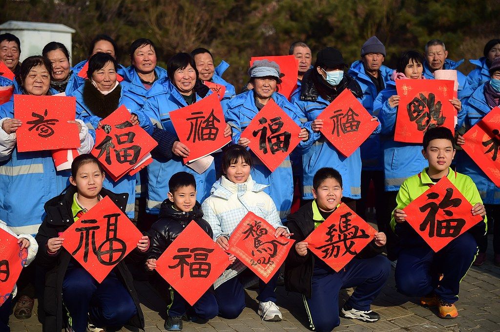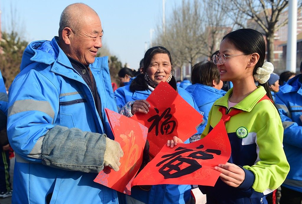 2026年1月26日,河北沧州市上海路小学开展“‘福’送环卫工”书法公益活动。小学生书法志愿者挥毫泼墨,为环卫一线工作者送上亲手书写的福字、对联,寄予新春祝福,环卫工们手持红彤彤的福字,脸上洋溢着幸福的笑容。