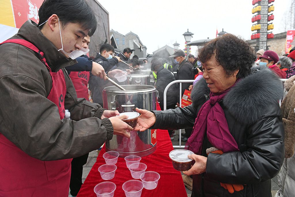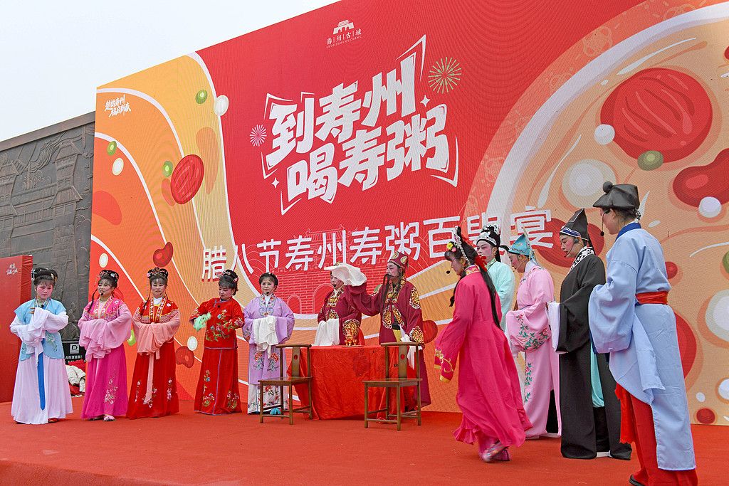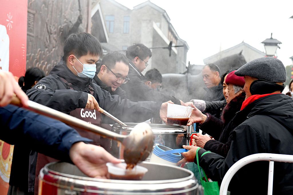 2026年1月26日,安徽省淮南市,市民、游客在寿县古城免费品尝腊八粥。当日是腊八节,安徽省淮南市寿县举行腊八节寿粥百叟宴活动,邀请市民、游客免费品尝2000份腊八粥,推介寿县独具特色的“寿”文化。