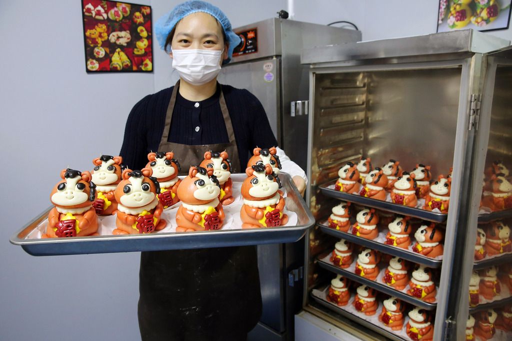 2026年1月27日,江苏连云港,一家“花饽饽”工作坊的员工在制作生肖卡通“福马”花馍。