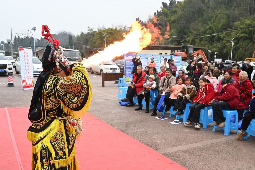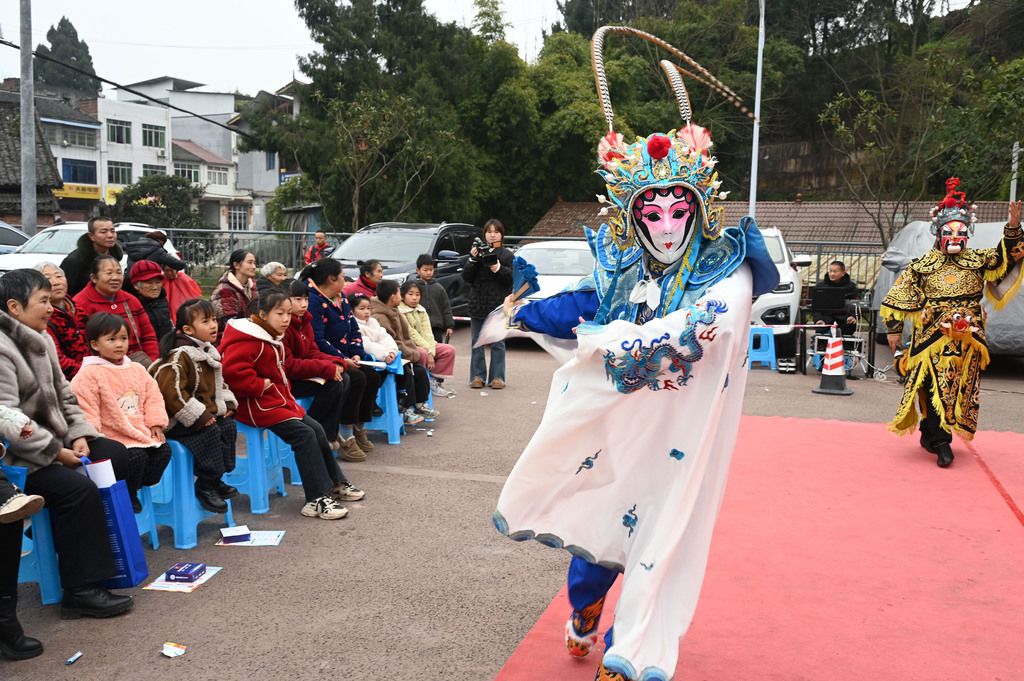 2026年1月28日,四川内江,东兴区川剧团的文化志愿者在永兴镇永兴社区为群众表演川剧节目。