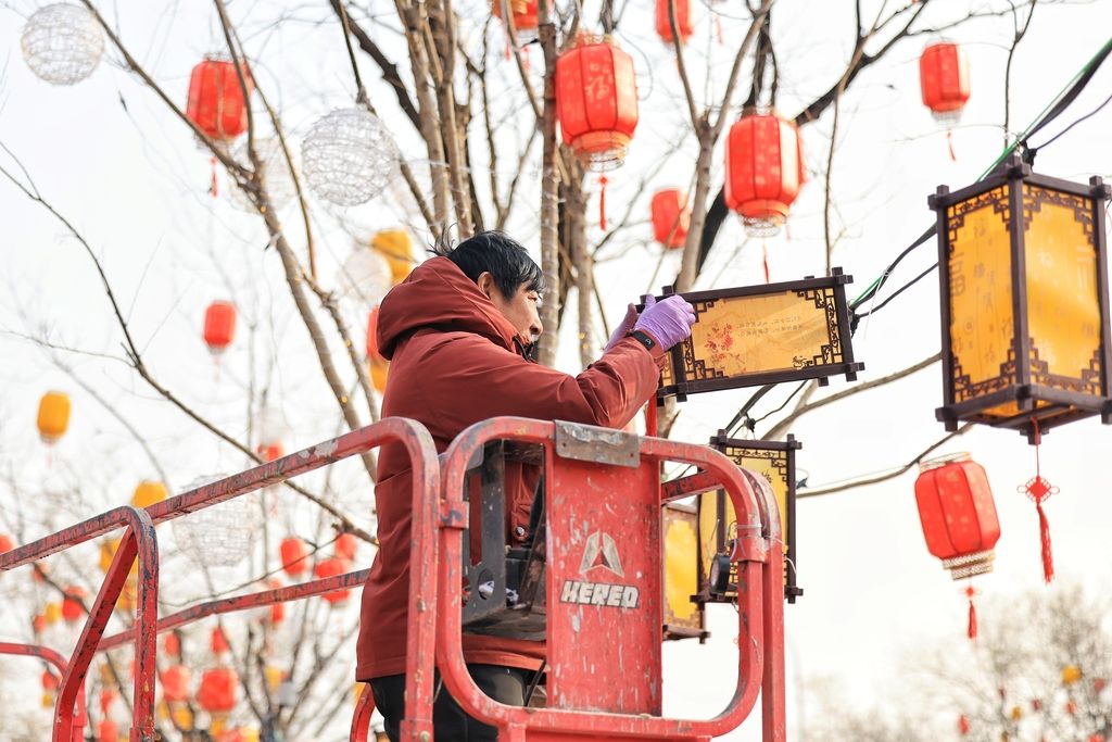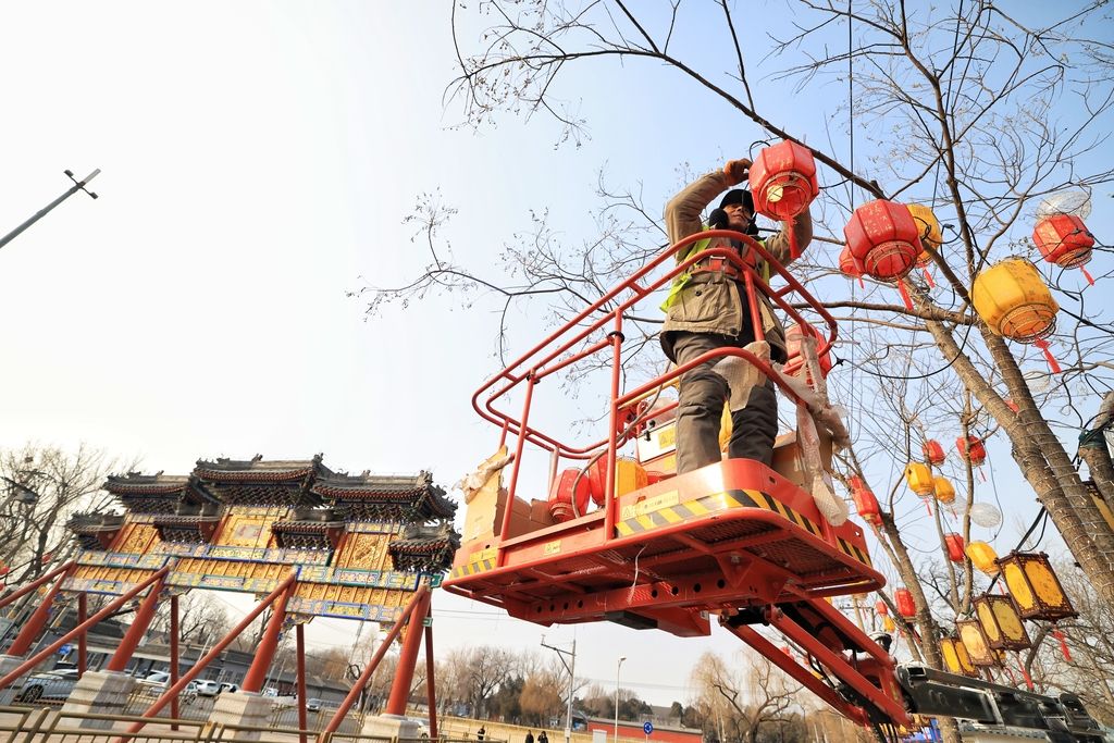 2026年1月28日,北京海淀区,同庆街年味渐浓。工人们在街道两旁的树枝上挂起红灯笼,红黄相间的灯笼与古色古香的街景相映成趣,为冬日的京城增添新春气息。