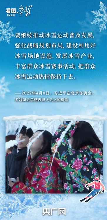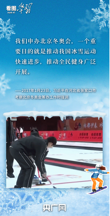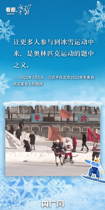 “让更多人参与到冰雪运动中来,是奥林匹克运动的题中之义。”习近平总书记高度重视我国冰雪运动的普及、推广和发展,指出中国筹办举办冬奥会和推广冬奥运动的重要意义,在于“让冰雪运动进入寻常百姓家,实现了带动3亿人参与冰雪运动的目标”,要“把群众冰雪运动热情保持下去”。