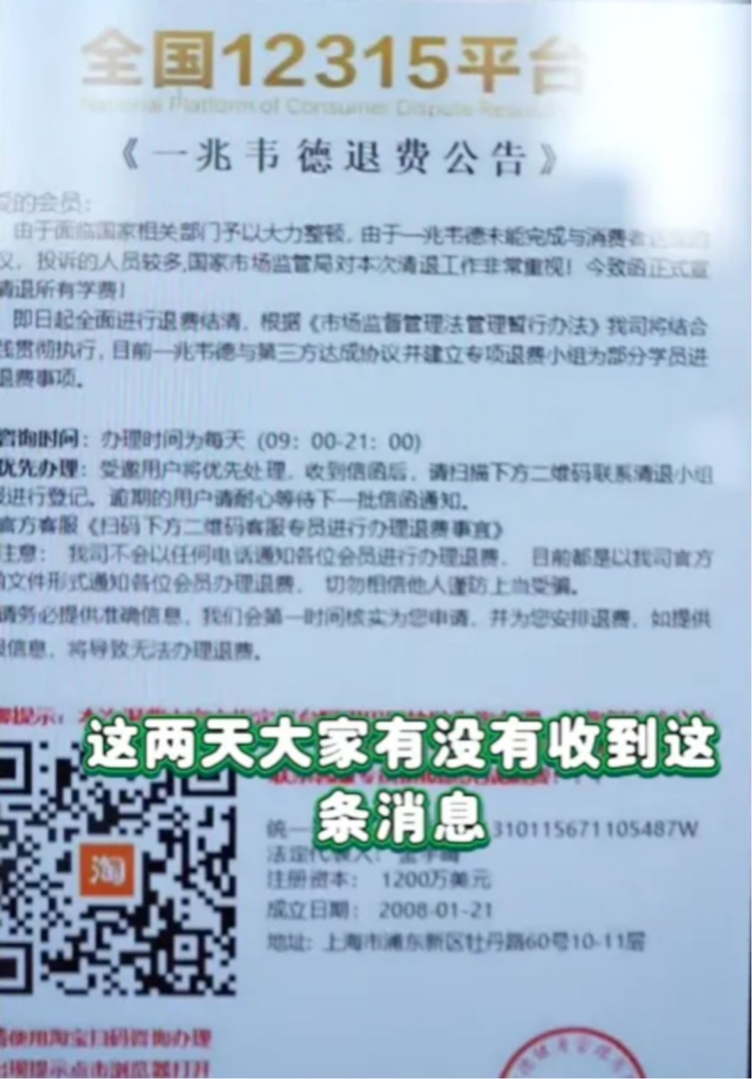 一兆韦德退费公告