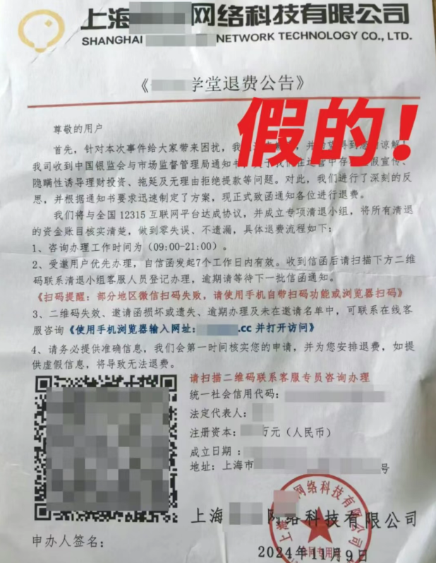 近期,有不法分子以“全国12315平台”名义,通过短信图片或邮寄等方式发送虚假退费公告,谎称联合全国12315平台办理“退费业务”,并以“办理退费事宜”为名,诱导消费者扫描虚假退费二维码,致使消费者利益受损(部分表现形式附后)。