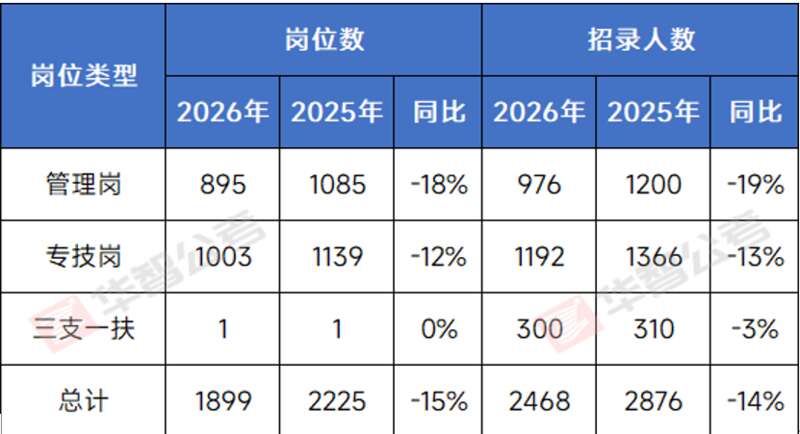 中国青年报客户端讯(中青报·中青网记者王烨捷)1月28日上海市2026年事业单位公开招聘公告发布。上海市人力资源和社会保障局介绍,今年上海部分事业单位将面向社会公开招聘一批工作人员,报名与笔试工作由上海市职业能力考试院和相关区人社局统一组织实施。2026年上海事业单位考试共计招录1899个岗位,2468人(包含“三支一扶”计划招募专项300人)。今年整体缩招约15%,岗位数量减少326个,招录人数减少408人。