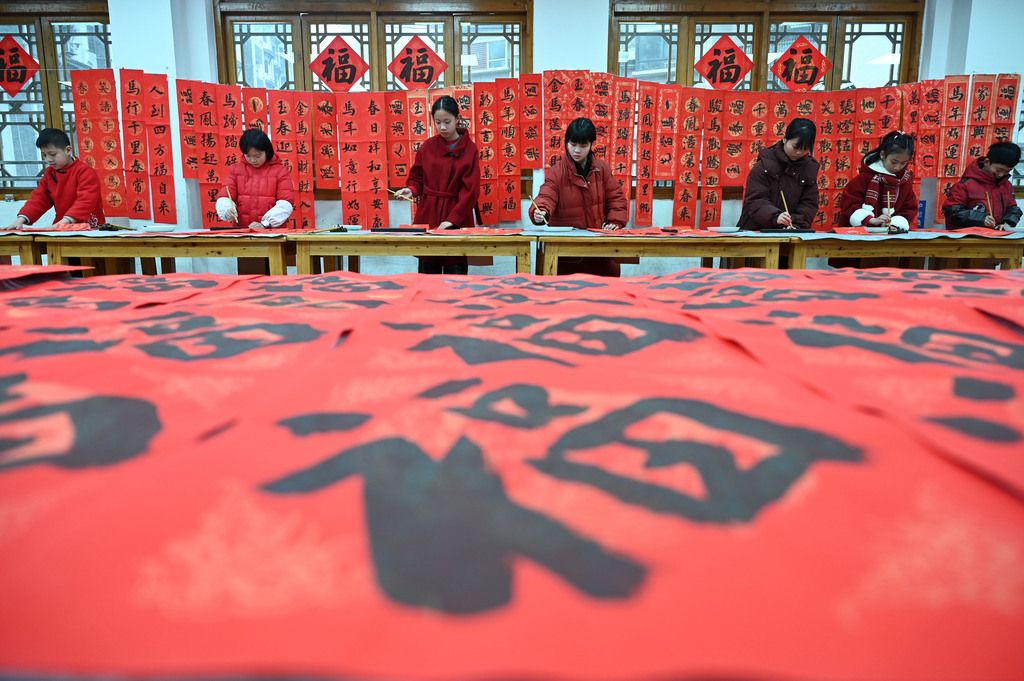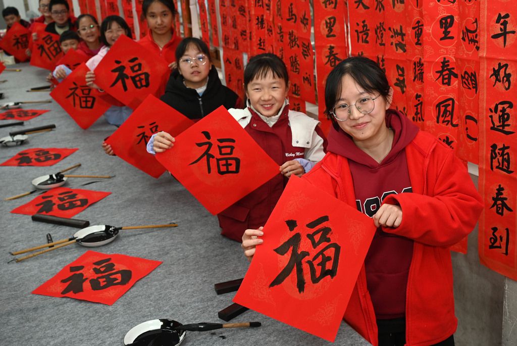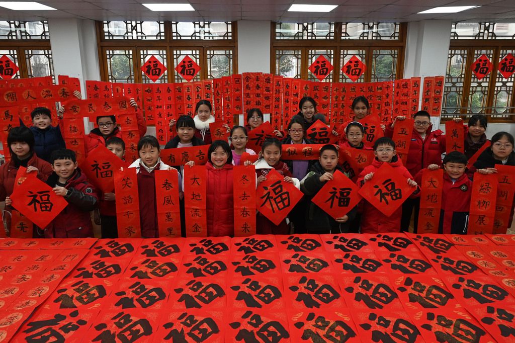 2026年1月29日,四川内江,小学生们在东兴区东兴老街为社区居民书写春联和“福”字。