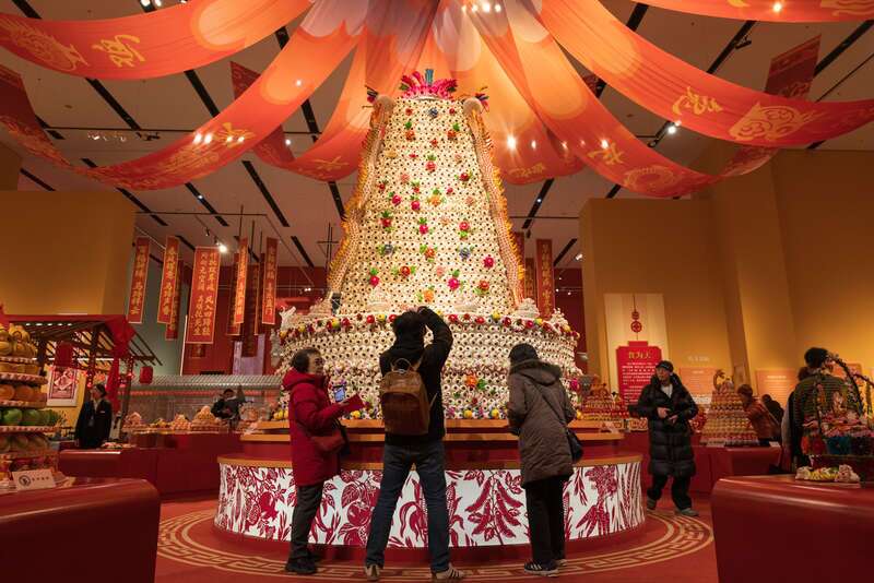 An exhibition on Chinese New Year traditions has opened at Beijing's National Museum of Chinese Arts and Crafts. It features over 100 intangible cultural heritage items, including foods, crafts, and customs. A 4.5-meter handmade decorative steamed bun is the highlight. Interactive activities and seasonal treats are available. The exhibition runs through March 20. (Photo by Yu Bijia/China Youth Daily)