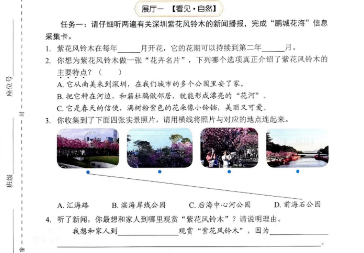 其中一道连线题让不少家长“炸锅”,该题目要求听两遍有关深圳紫花风铃木的新闻播报,将四张实景照片与对应的南山区地点连线。