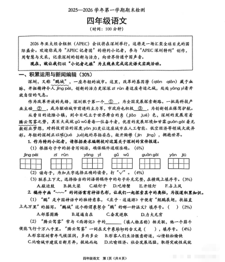 综合南方都市报报道,南山区四年级语文期末卷以2026年APEC会议特约小记者之旅为主线,要求学生完成“APEC深圳特刊”语文实践创作,试卷共6页,答题时间100分钟。