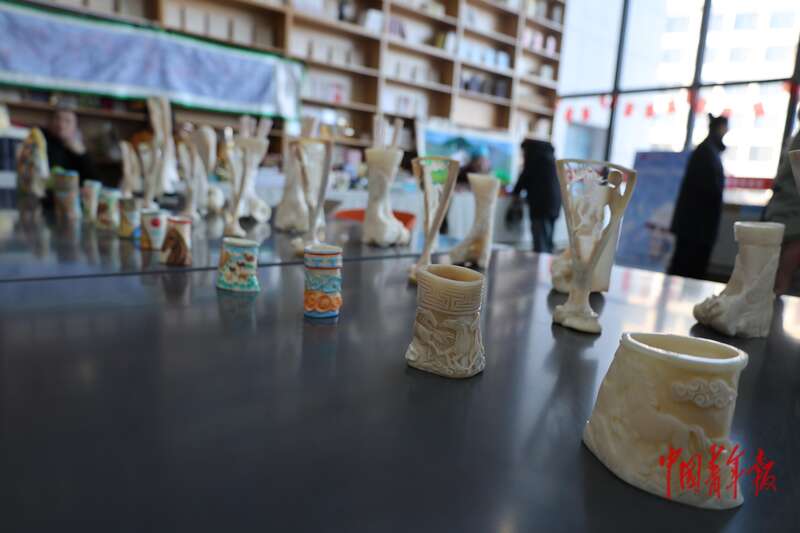 1月30日,苏尼特右旗非遗年货节展出的骨雕作品。中青报·中青网记者 石佳/摄