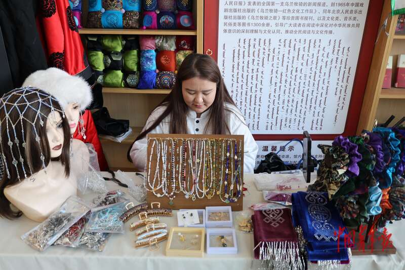 1月30日,在苏尼特右旗非遗年货现场,展出的具有蒙古族特色的头饰、发饰、项链。中青报·中青网记者 石佳/摄