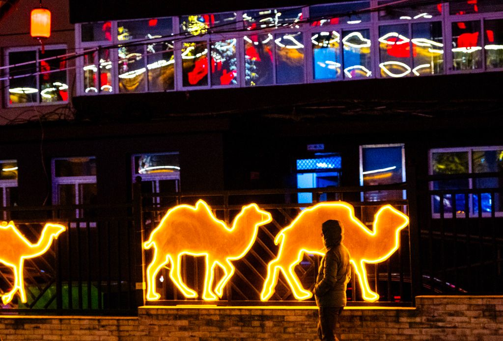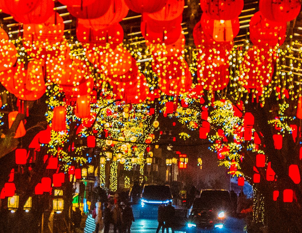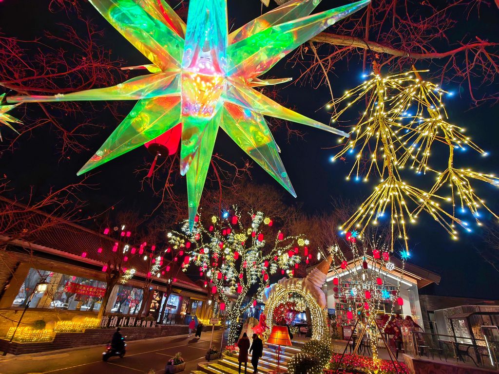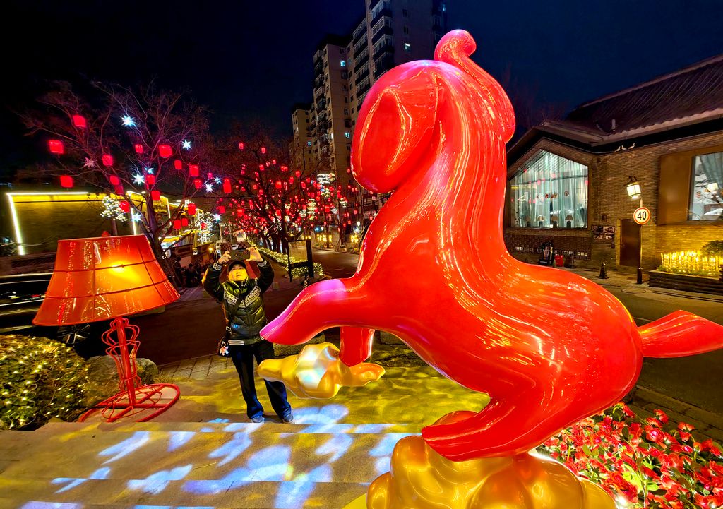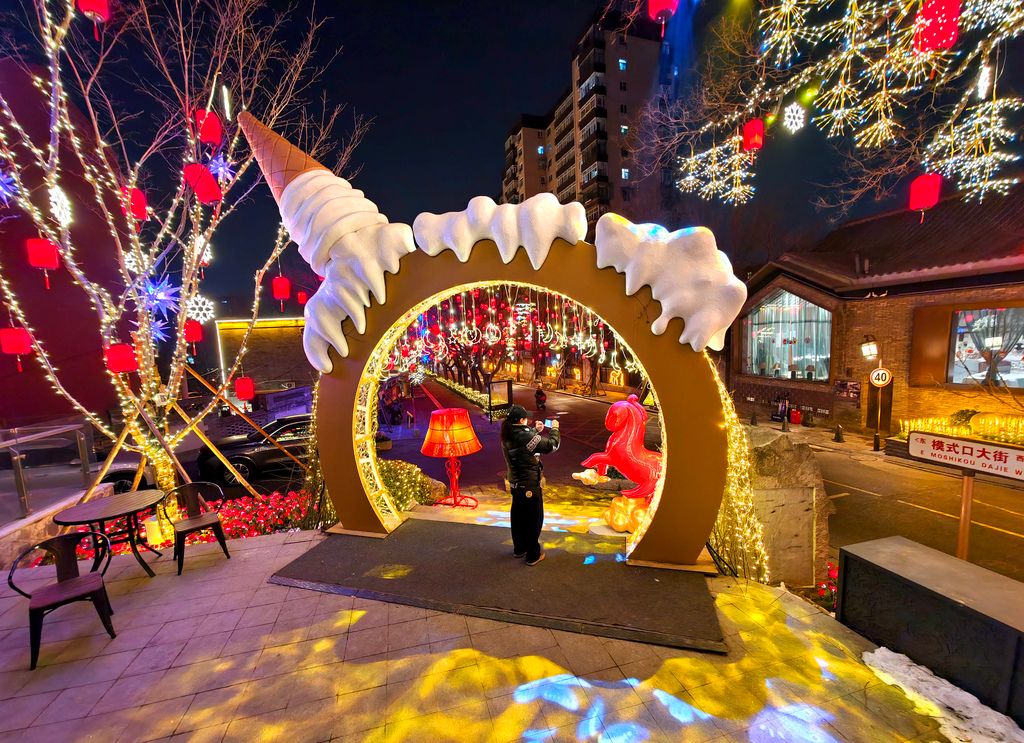 2026年1月29日,北京石景山区,模式口大街花灯璀璨,吸引市民游人前来打卡拍照。