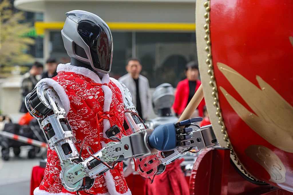 2026年1月29日,广东深圳,灵心巧手Linkerbot乐队机器人在“全球首家机器人6S店”前演出,这支人形机器人乐队是灵心巧匠公司的“灵心乐府”产品,“鼓手”与“琴师”使用了不同类型的灵巧手产品,前者能够做出力度较大的打击动作,而后者采用了更为灵巧、动作敏捷的电子手,表演吸引不少市民围观,也印证了科技赋能文化的广阔前景。