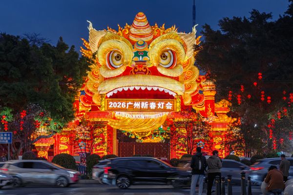 2026年1月30日,广东广州,“粤韵千年·四海同心”2026广州新春灯会启幕。图为以岭南醒狮为主题的20米高巨型灯组。