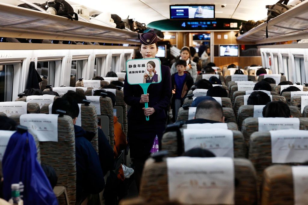 2026年2月1日,列车员手举提示牌行走在上海虹桥至北京南的G8次高铁列车静音车厢内。自2026年2月1日起,铁路部门“静音车厢”服务拓展至超过8000列动车组,覆盖中国高铁网络的主干线路和主要客流通道。 中新社记者 殷立勤 摄