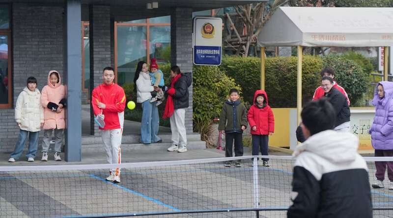 成都大运会金牌得主曹茂园与居民互动。四川体育职业学院供图