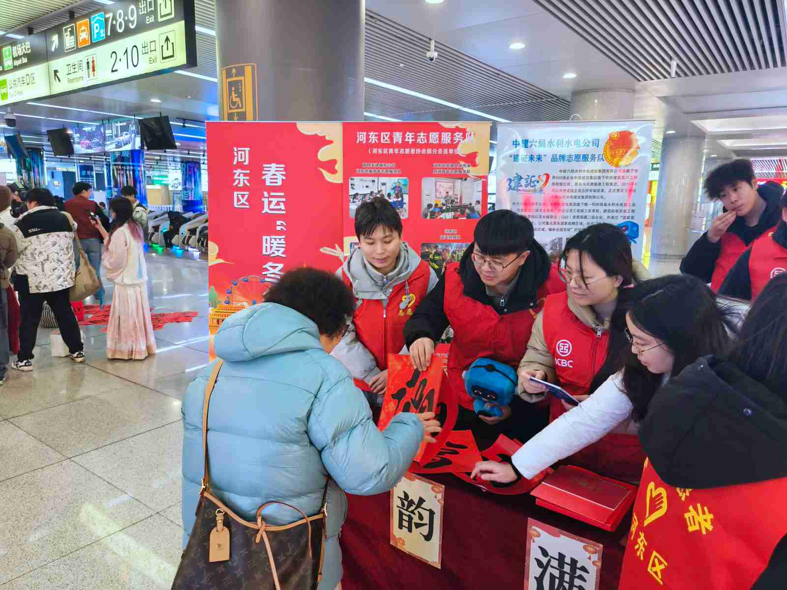 结合春运出行特点与旅客需求,志愿者们还推出系列特色服务,在团河东区委带领下,他们开展“暖冬送福”活动,为返乡旅客送上春联、福字等新春纪念品,让归乡之路满载年味与暖意。
