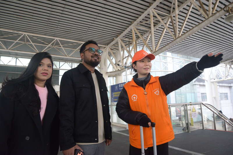 镇江站青年志愿者为外国旅客提供乘车指引服务。胡伟忠/摄