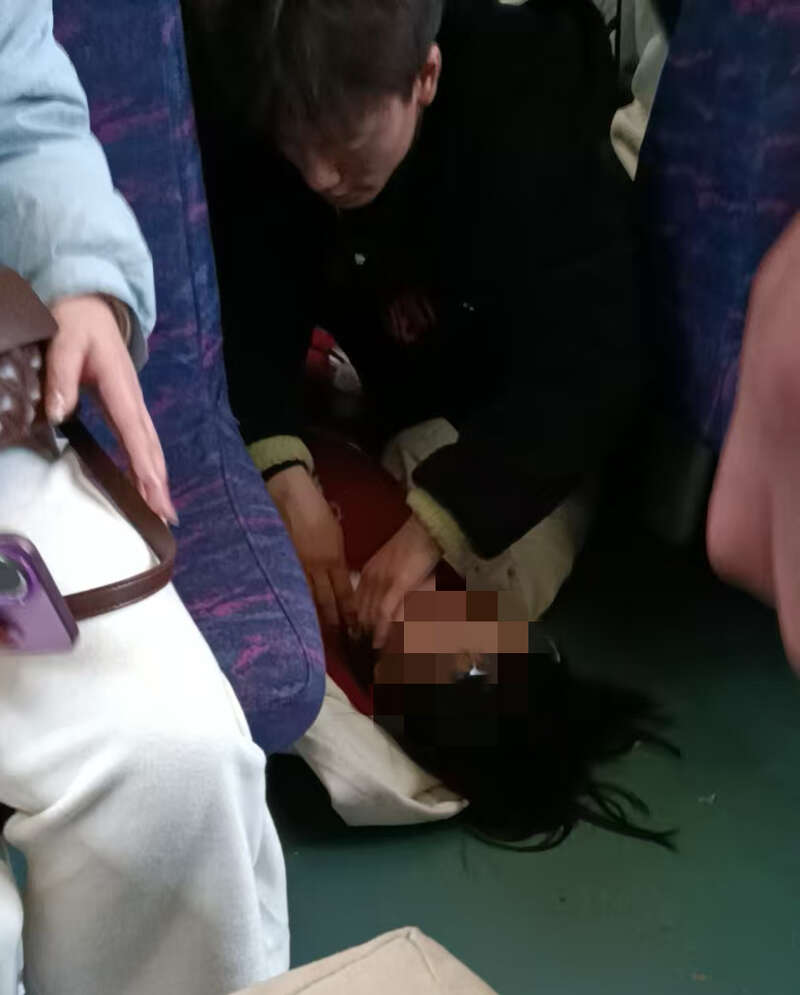 肖丁杰到达的时候,乘务员与几名热心乘客围拢在患者周围。昏迷的女性乘客面色苍白,几乎失去了意识,瘫倒在硬座车厢的座椅旁。