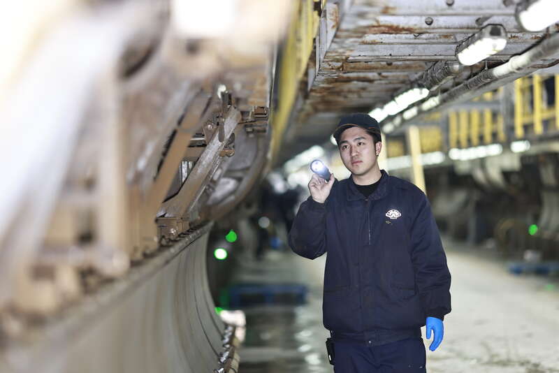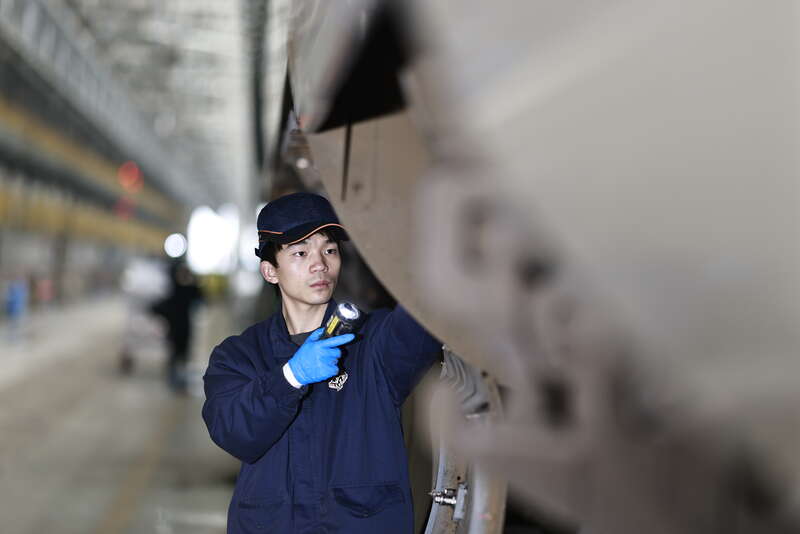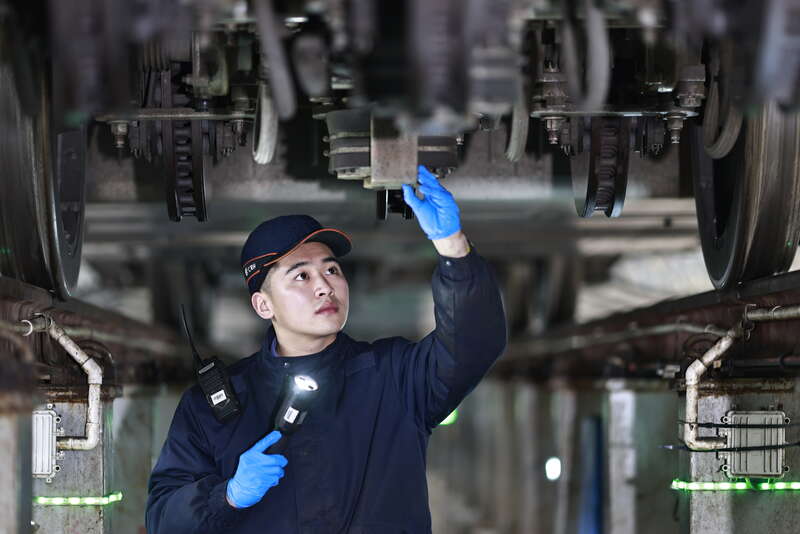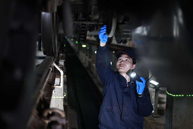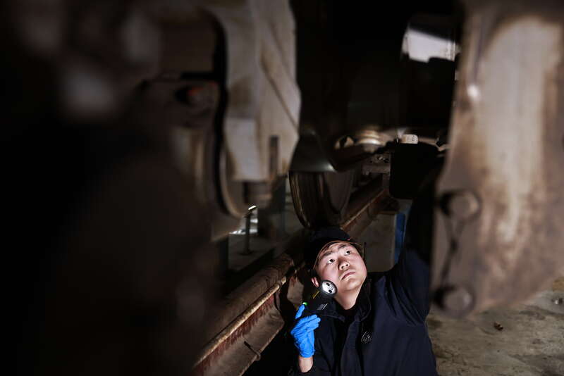 2月3日,重庆,中国铁路成都局集团有限公司重庆车辆段重庆西动车运用车间,00后动车组机械师王腾尹对动车组的轮对进行检修。苏志刚/摄