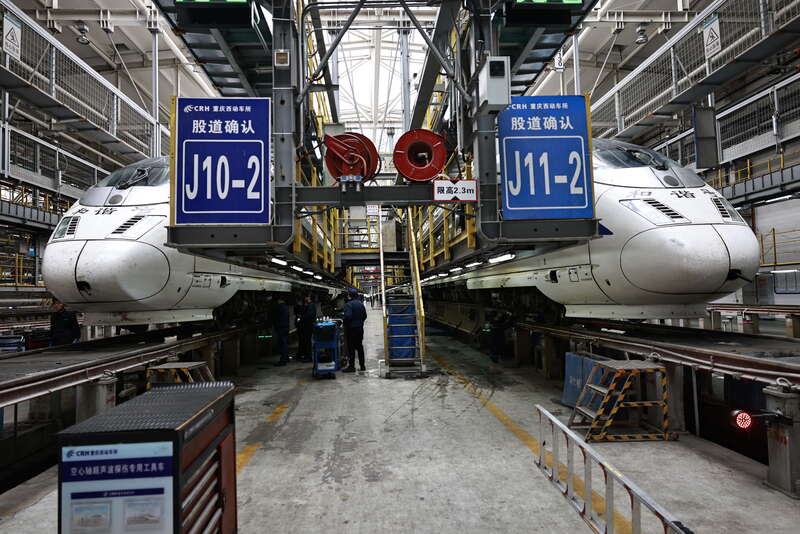 2月3日,重庆,中国铁路成都局集团有限公司重庆车辆段重庆西动车运用车间正在进行二级修的动车组。苏志刚/摄