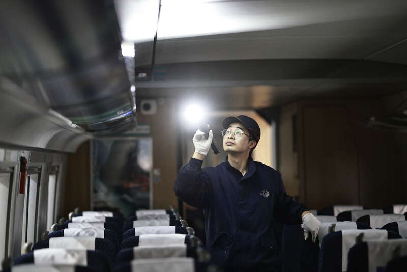 2月3日,重庆,中国铁路成都局集团有限公司重庆车辆段重庆西动车运用车间,00后动车组机械师李功恒对动车组的上部设施进行检查。苏志刚/摄