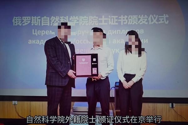 2022年,俄罗斯自然科学院副院长博拉耶夫为一家企业董事长颁发外籍院士证书。记者翻拍