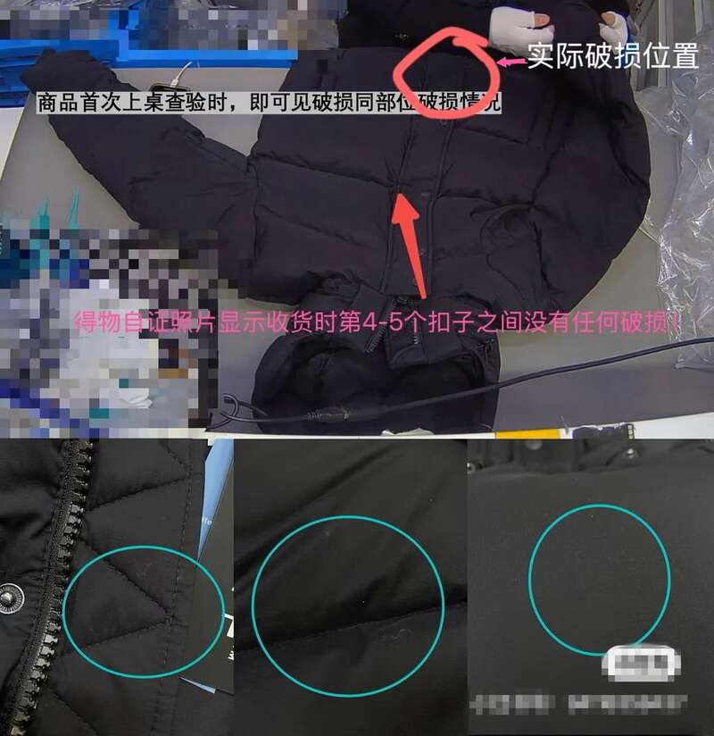 小淑女士在沟通中提出,得物方面提供的首次上桌查验照片与羽绒服实际受损情况不符,“得物提供的照片,羽绒服受损位置位于第三个扣子处,但实际上是第四和第五个扣子之间。”