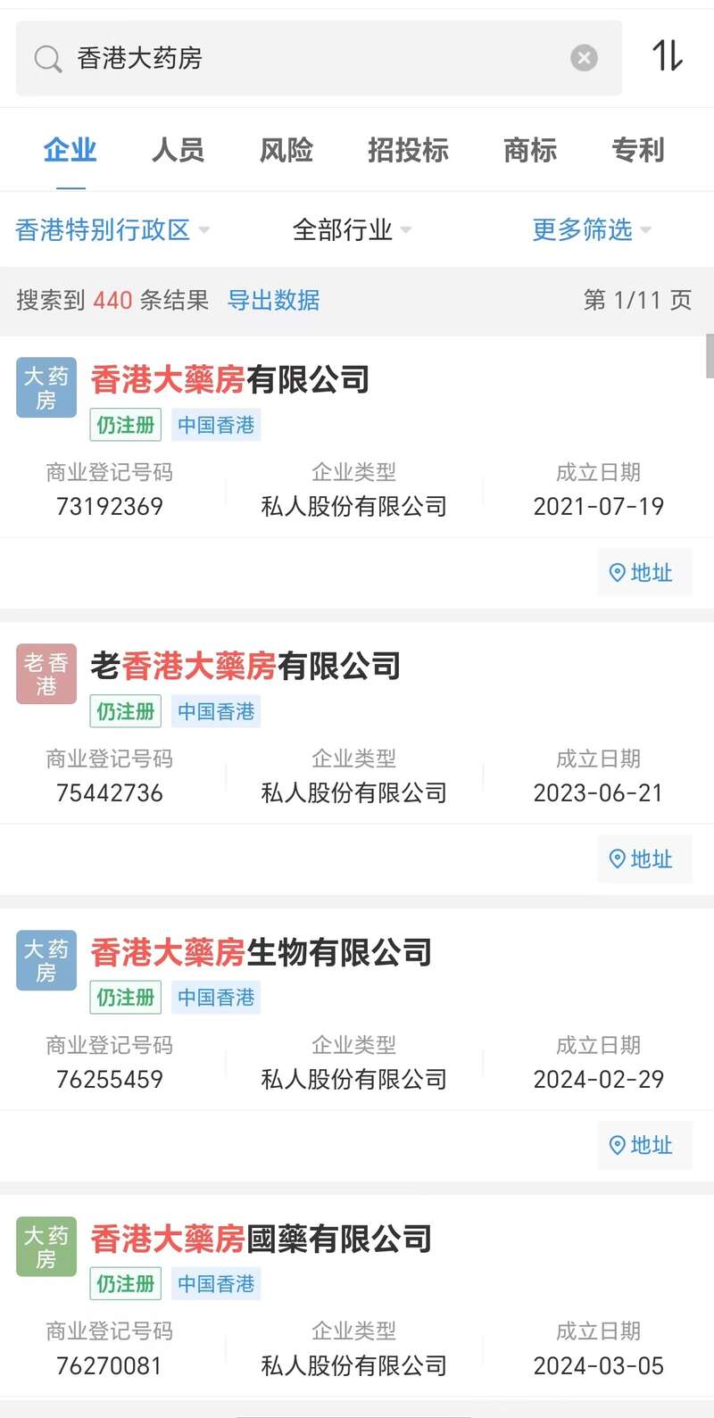 记者以企业名称中包含“香港大药房”字样、注册地为香港且目前仍在存续状态为条件,在企查查平台搜索,发现目前在香港有440家“香港大药房”。其中,在最近1至3年时间内成立的“香港大药房”就有312家。这些打着“香港大药房”旗号的公司,本质上究竟是普通公司还是医药企业抑或医疗研发机构?一名商家对记者透露,香港大药房国医有限公司是“一家公司”,另一名商家则称香港大药房制药科技有限公司是“一个企业,在内地有很多个厂家。”记者在企查查检索核查发现,下单购买的三个产品背后所属公司,在系统中描述为“私人股份有限公司”。