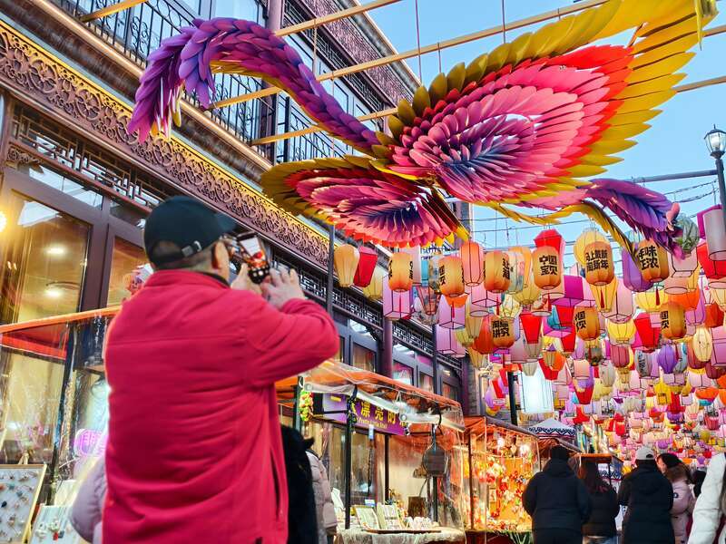 Beijing’s historic Qianmen Street has illuminated the winter night with a spectacular array of crimson lanterns and lively fairs, turning the ancient commercial district into a vibrant stage for cultural heritage and holiday joy. Visiting on February 2, from the retro trams trundling past the Zhengyang Bridge to the traditional sugar figurines and mouth-watering snacks in Xianyukou Hutong, visitors like Ms. Liu find that the dazzling interplay of phoenix lanterns and ancient architecture not only provides a stunning backdrop for photos but also immerses them in the authentic "flavor" of the Lunar New Year.(Photo by Zhang Jiao/China Youth Daily)