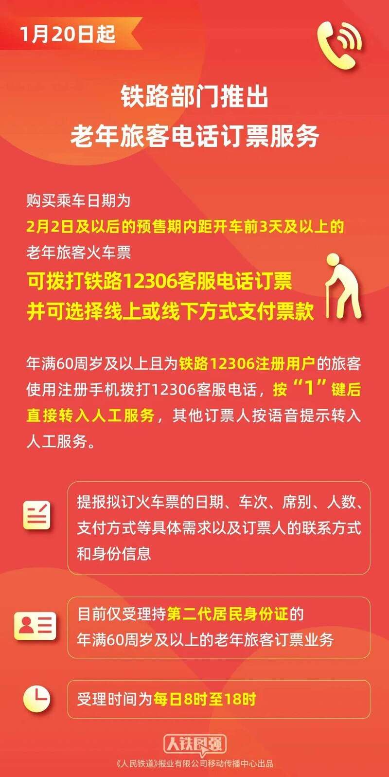 三是为老年人提供电话订票服务,拨打12306可预订距开车前3天及以上的车票,成功后支持线上支付或窗口线下支付。