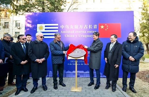 2月4日立春日,奥尔西到访北京外国语大学,为中乌友谊树浇水、培土。这是2013年时任乌拉圭总统穆希卡访华时种下的一棵云杉树,如今苍翠茂盛。树旁的展板上,用中西双语写着“中乌友谊万古长青”。