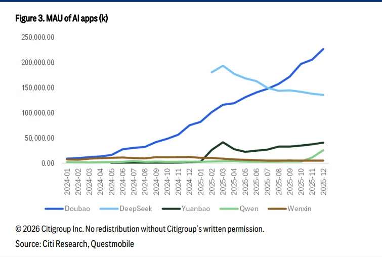 从投流回报率来看,豆包全年投流金额仅4亿元,却长期排在各大应用榜第一,据华尔街见闻报道,花旗最新研报显示,截至2025年12月,豆包月活用户数(MAU)达2.27亿,日活跃用户数(DAU)已达7000万,部分AI助手人均使用时长已超过100分钟。