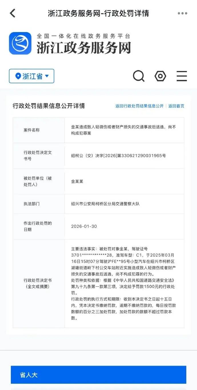 被处罚对象金某,驾驶证号3701************28,准驾车型:C1,于2025年03月16日15时07分驾驶沪FE**95号小型汽车在绍兴市柯桥区湖塘街道岭下村公交车站附近实施造成致人轻微伤或者财产损失的交通事故后逃逸,尚不构成犯罪的行为。